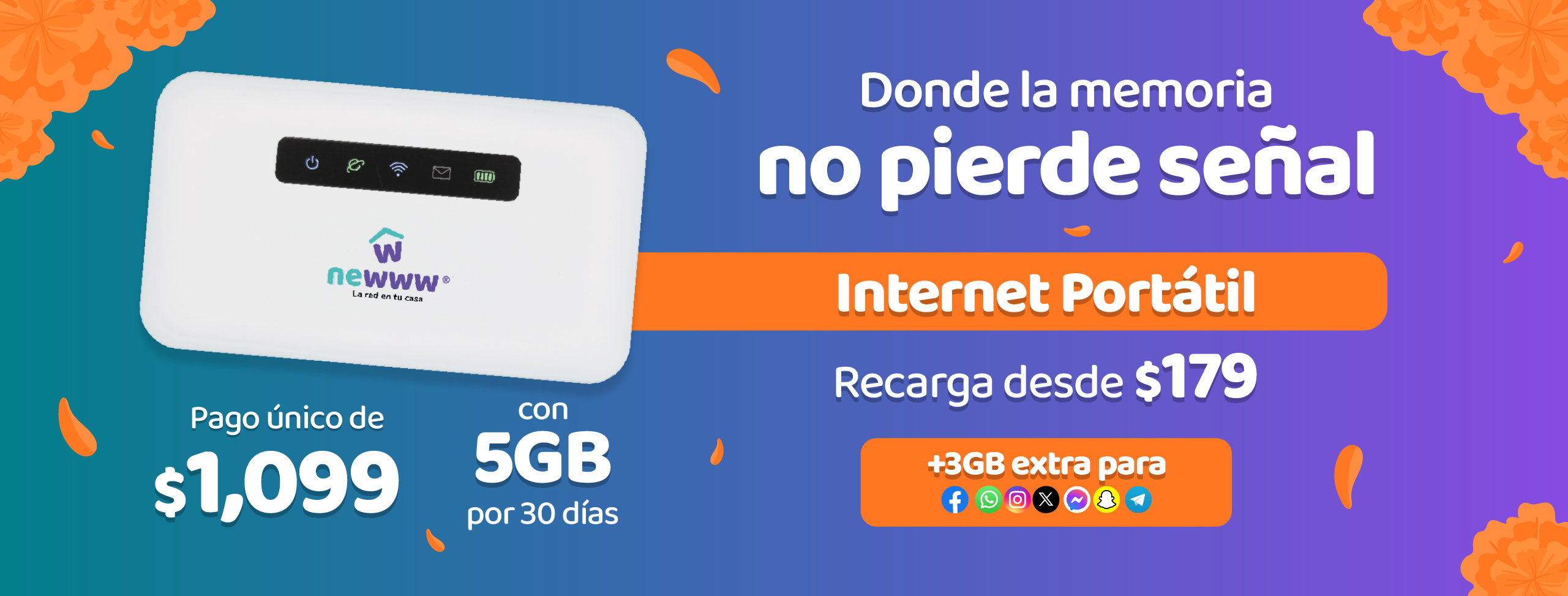 Todos los precios incluyen IVA y están expresados en Moneda Nacional. Las tarifas y promociones de Newww se encuentran inscritas en el Registro Público de Concesiones del Instituto Federal de Telecomunicaciones con los siguientes números: 1558011, 1557996, 1558021, 1558027, 1558036, 1558162, 1558165, 1558168, 1558170 y 1558181 podrán consultarse en el hipervínculo correspondiente al Visor de Tarifas del registro Público de Telecomunicaciones de ese instituto, en la dirección electrónica: https://tarifas.ift.org.mx/ift_visor/