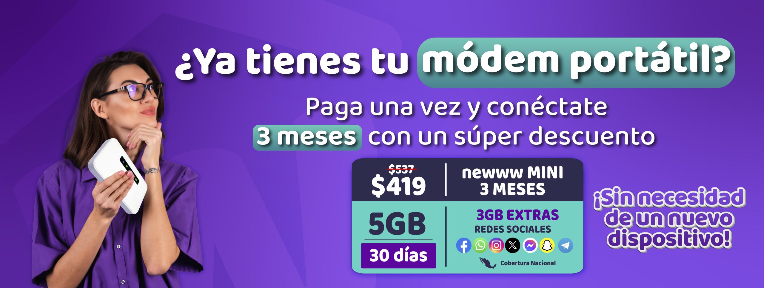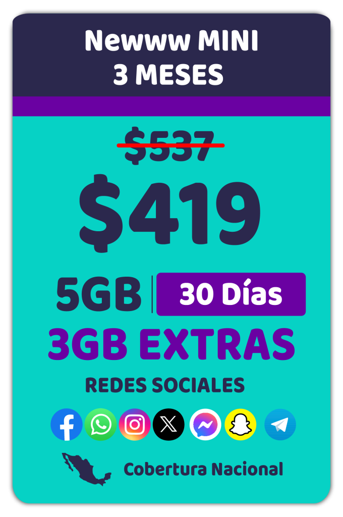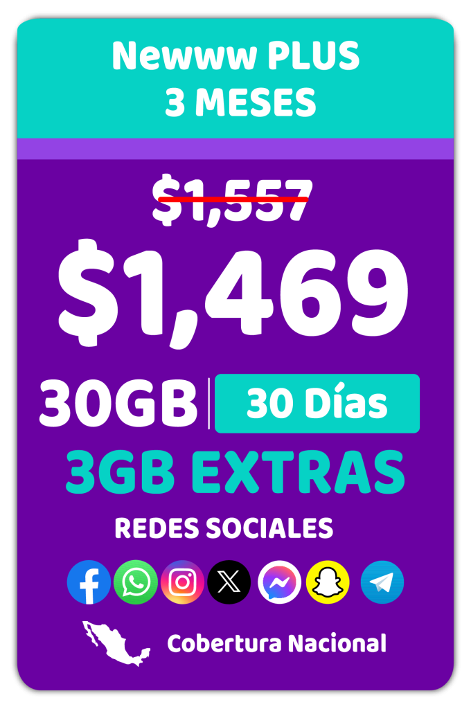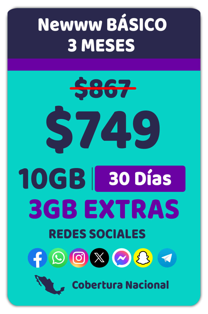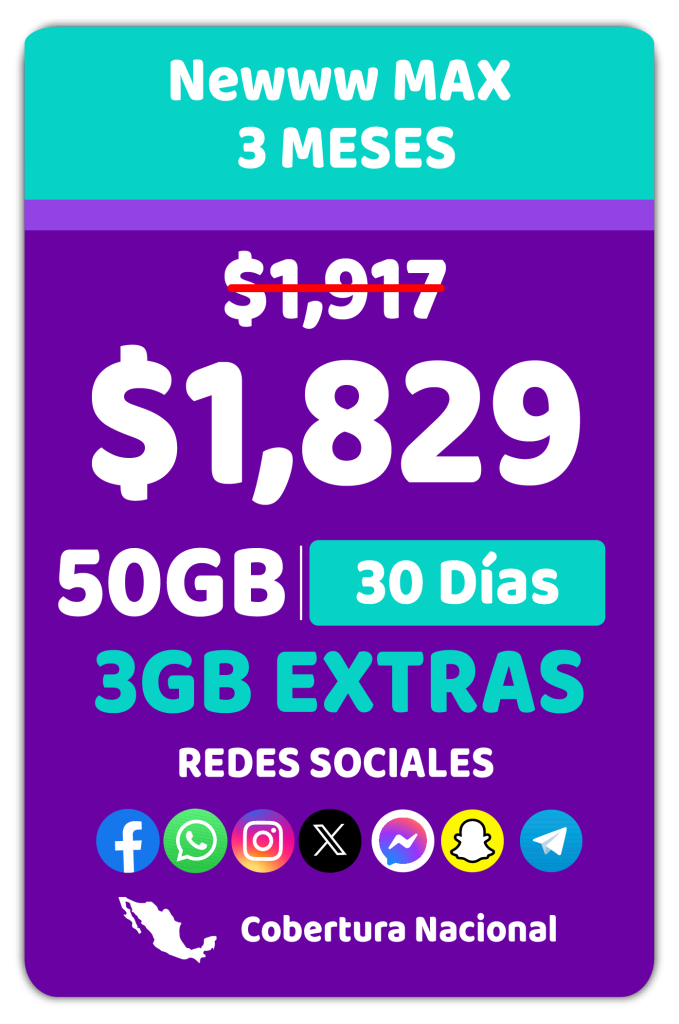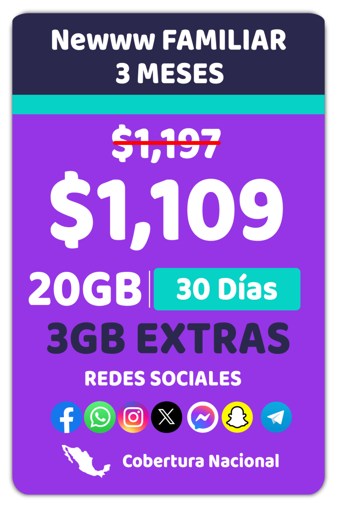 Todos los precios incluyen IVA y están expresados en Moneda Nacional. Las tarifas y promociones de Newww se encuentran inscritas en el Registro Público de Concesiones del Instituto Federal de Telecomunicaciones con los siguientes números: 408403, 400898, 400903, 400916, 400924, 408405, 400906, 400910, 400919, 400927, 422422, 400967 y 409557 podrán consultarse en el hipervínculo correspondiente al Visor de Tarifas del Registro Público de Telecomunicaciones de ese Instituto, en la dirección electrónica: https://tarifas.ift.org.mx/ift_visor/