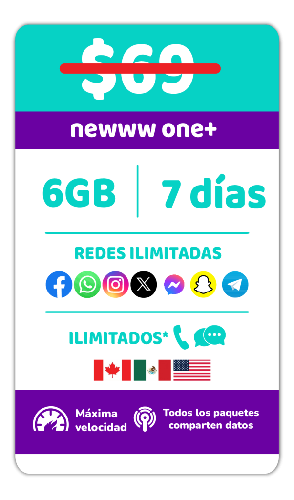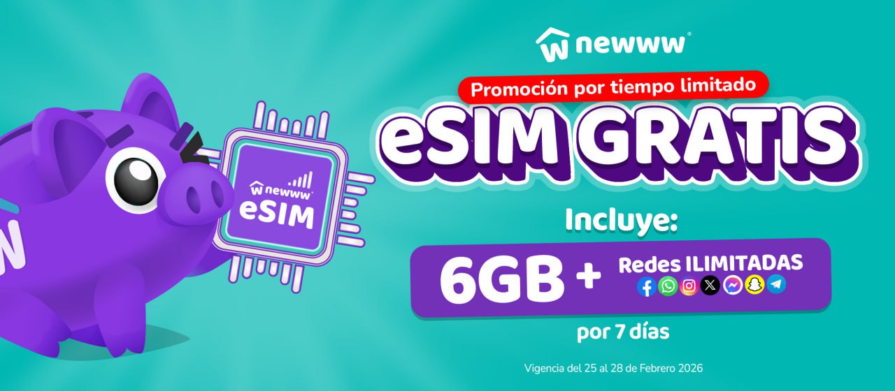 Todos los nuevos clientes de Newww que activen su primera eSIM del 25 de Febrero al 31 de Marzo 2026. Recibirán una eSIM gratis + el paquete newww one+ que te da: 6 GB por 7 días, redes sociales ilimitadas (Facebook, WhatsApp, Instagram, Messenger, Snapchat, X, Telegram)